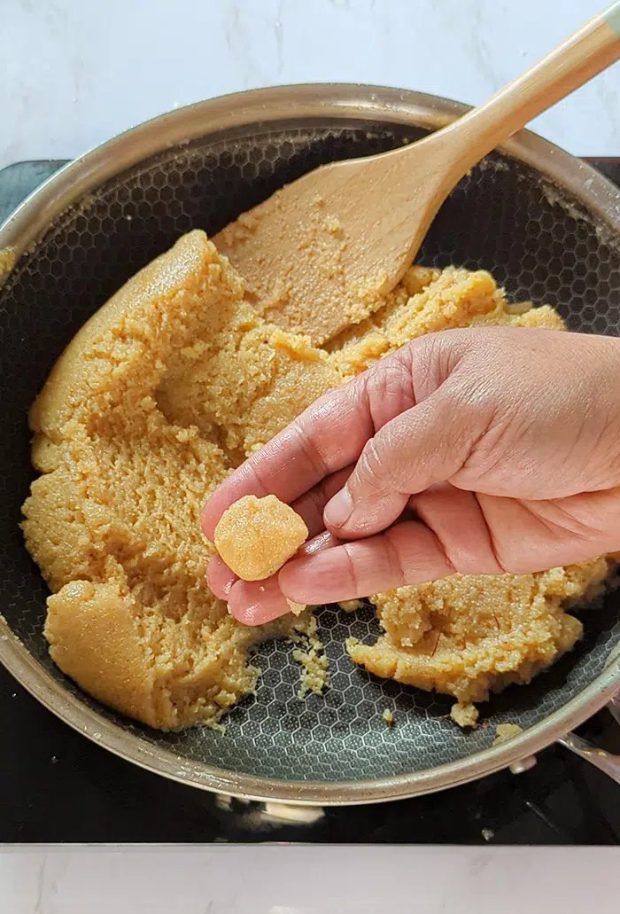 - As the syrup evaporates, the bubbles disappear, and the sooji mixture thickens and turns into a soft dough. Turn off the heat.
