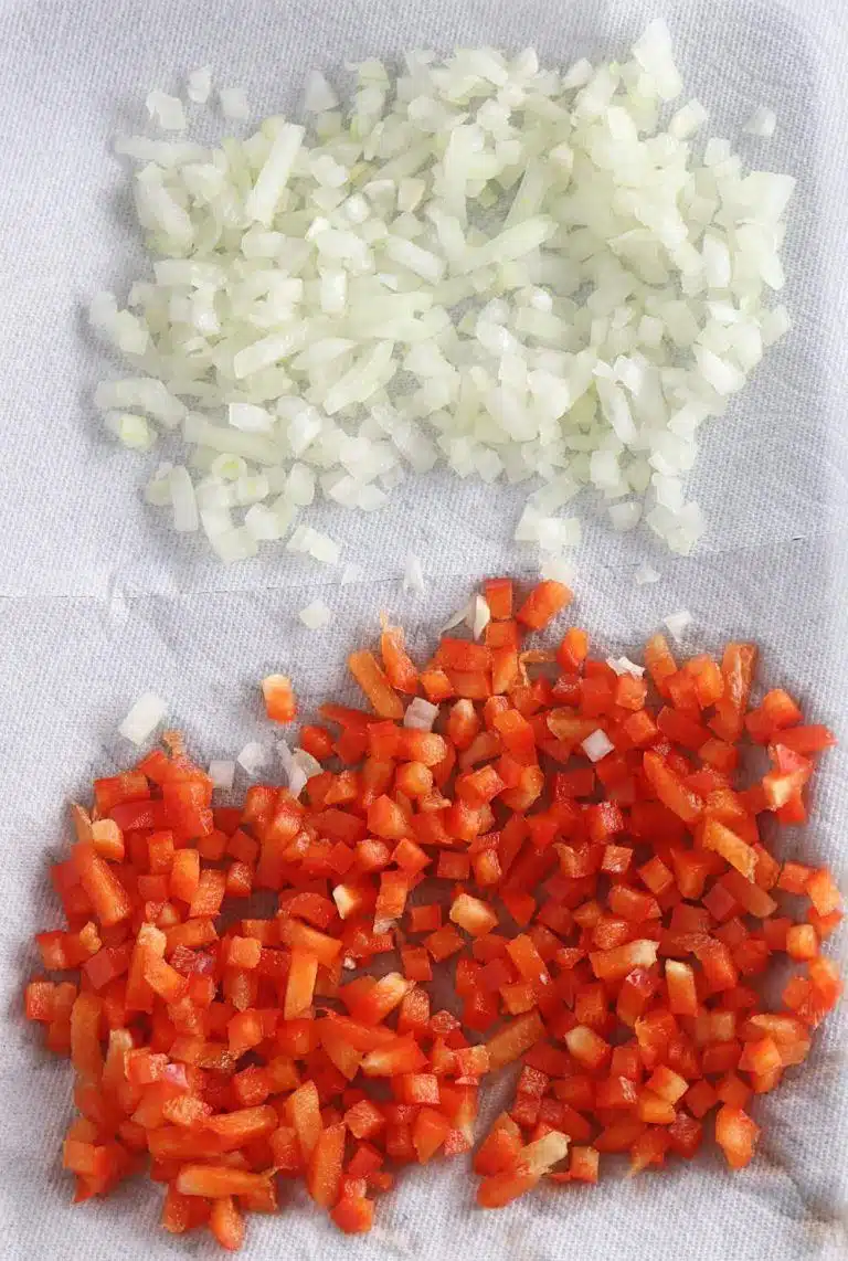 » Chop and pat dry the vegetables – Peel and finely chop the onions and bell peppers. Now, wrap the chopped vegetables in between two paper towel sheets. The paper towel will soak up all the moisture from the vegetables. Extra moisture in veggies will make the dough difficult to bind.