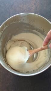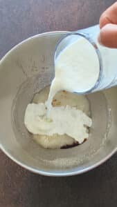 Once that creamy consistency is achieved, add vanilla essence ( to the oil + sugar mix) to create that irresistible aroma. Pour in buttermilk.
