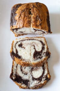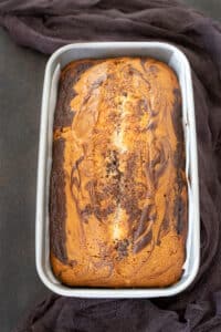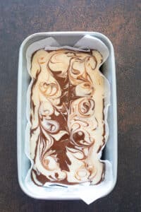 Use a butter knife or a toothpick to swirl them together gently for a marbled appearance. Tap the pan firmly on the counter. Tip — Tapping releases the steam from the cake, thus preventing it from shrinking. Bake at 350°F for 30-35 minutes, or until the toothpick inserted in the center comes out mostly clean but with a few moist crumbs.