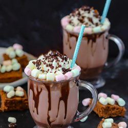 If you love chocolate, then this Brownie flavored frozen hot chocolate is just for you. It’s the iced version of hot chocolate that is insanely delicious, creamy, and very addicting. This frozen drink is packed with rich flavors of hot chocolate, homemade brownies, and topped with whipped cream and marshmallows for some fun!
