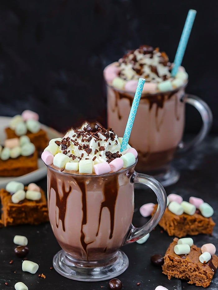 Serve immediately topped with whipped cream frosting, colorful marshmallows, brownie crumbles, some chocolate sprinkles, and enjoy!