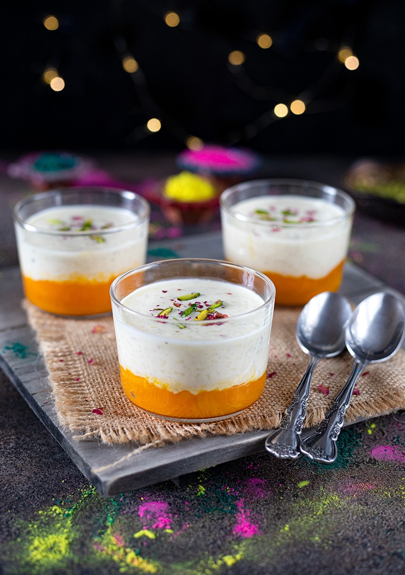 The best part is that, the flamboyant yellow color of the mango compote blends harmoniously with the white profile of rice kheer to create an exquisite color and flavor kaleidoscope that’s pure bliss!!