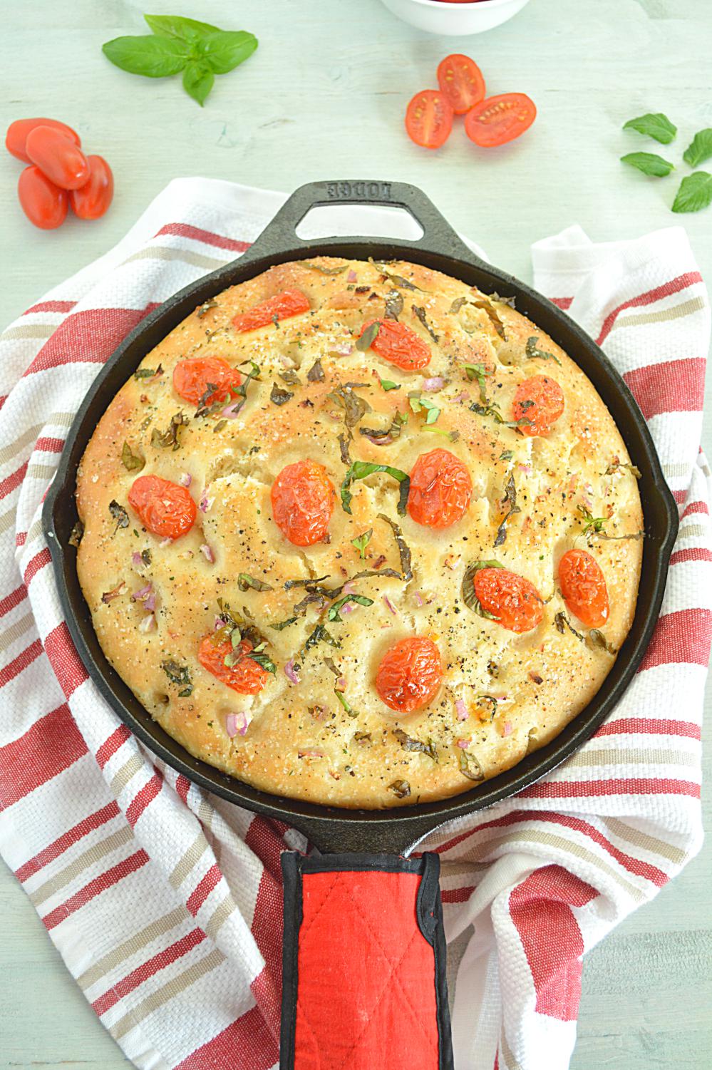 Today’s recipe, no-knead tomato basil focaccia bread takes just one hour to make from start to finish.