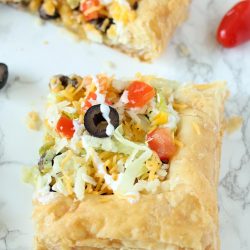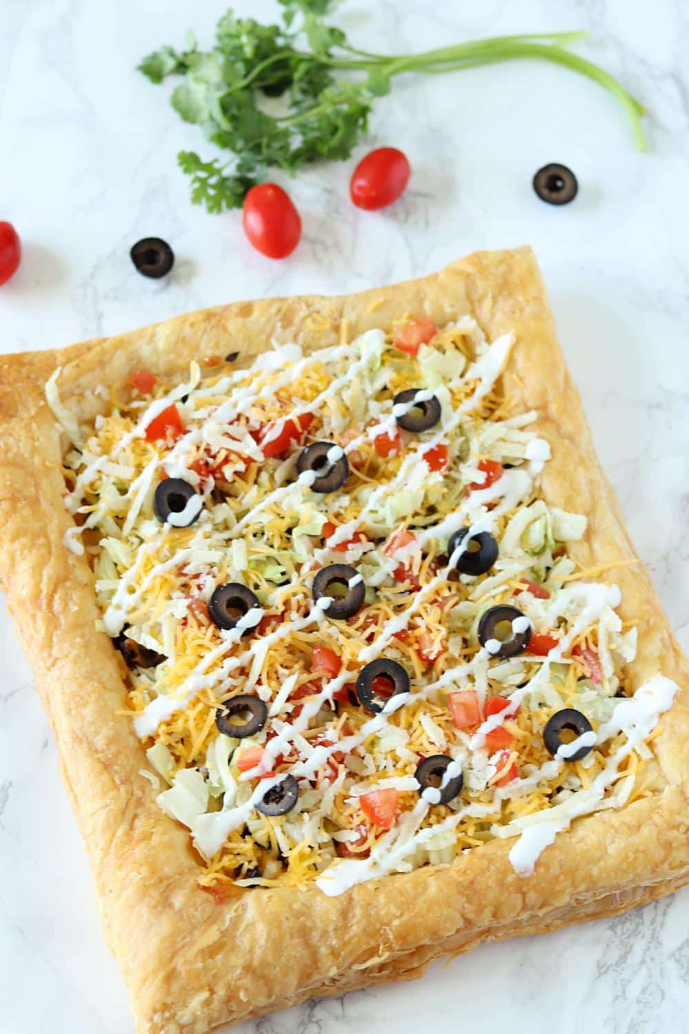Whether you are entertaining a large group or hosting a simple dinner, these Easy Puff Pastry Taco Pizza is a perfect go-to comfort food recipe. Store-bought puff pastry is topped with simple ingredients and then baked until golden and flaky.