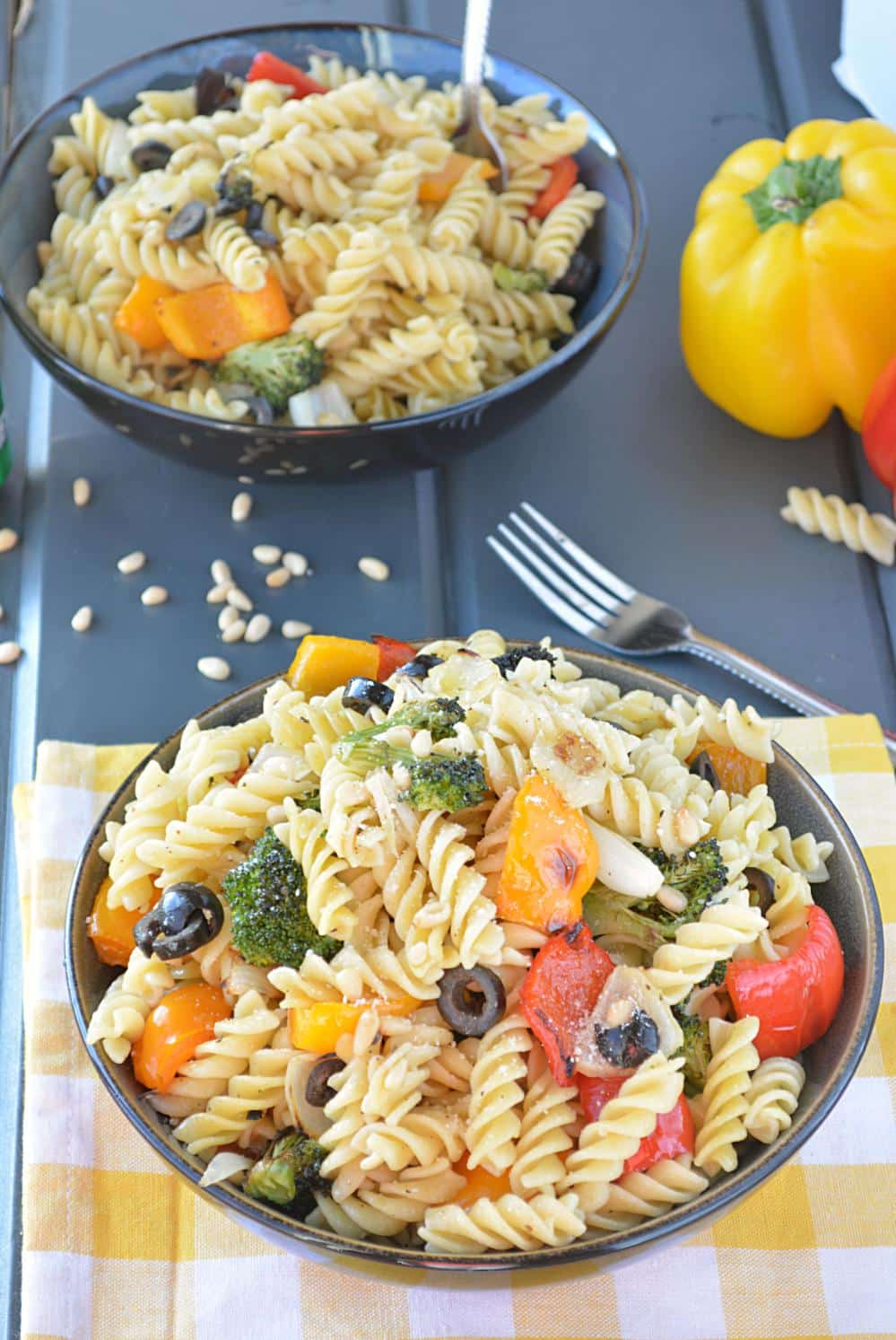 RECIPE DETAIL – I have used fusilli or rotini pasta for this recipe but feel free to substitute it with your favorite one. Grilling colorful veggies makes a huge difference and is worth the extra effort. Flavors of grilled veggies add color and crunch to this salad and they blends perfectly with pasta. This recipe uses garlic salt, but if you don’t have garlic salt – no worries, just grate 2 small cloves of garlic, mix it in 2 teaspoon of olive oil, and rub it over the veggies. To bring out the wonderful nutty flavor, pinenuts are toasted and added to the salad. Pinenuts can be substituted with toasted walnuts or almonds.