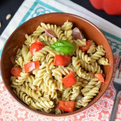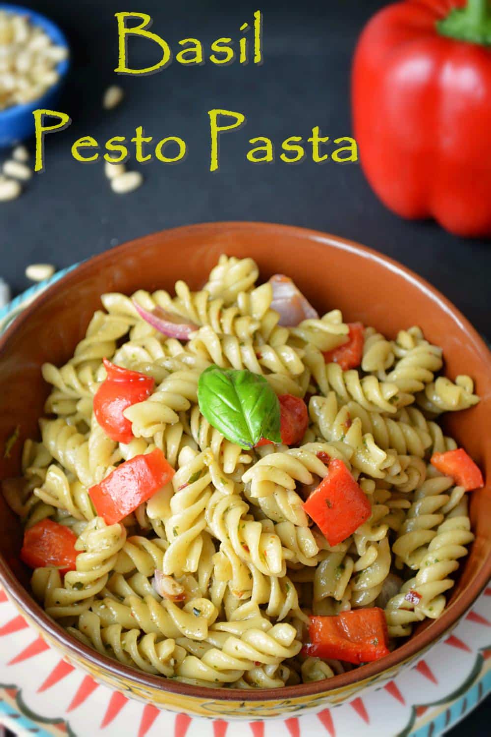 Enjoy this one pot meal prepared with homemade basil pesto and combined with caramelized onion and red bell pepper. Kid-friendly and makes a great school lunch, hot or cold ! Can even be made for a pot luck dinner or picnic parties. Combination of pesto and Rotini pasta gives this dish a subtle nutty flavor,very delicious, and tasty. You can choose any kind of pasta to make this dish – use wheat Rotini for healthier options. Adding onions and red bell pepper provided that extra crunch and I think without the extra veggies it would have been kind of dull.