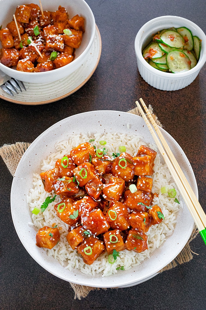 Cornstarch — It makes the tofu pieces crispier and more delectable. It coats each piece and helps them get the golden brown crust that looks so tempting.