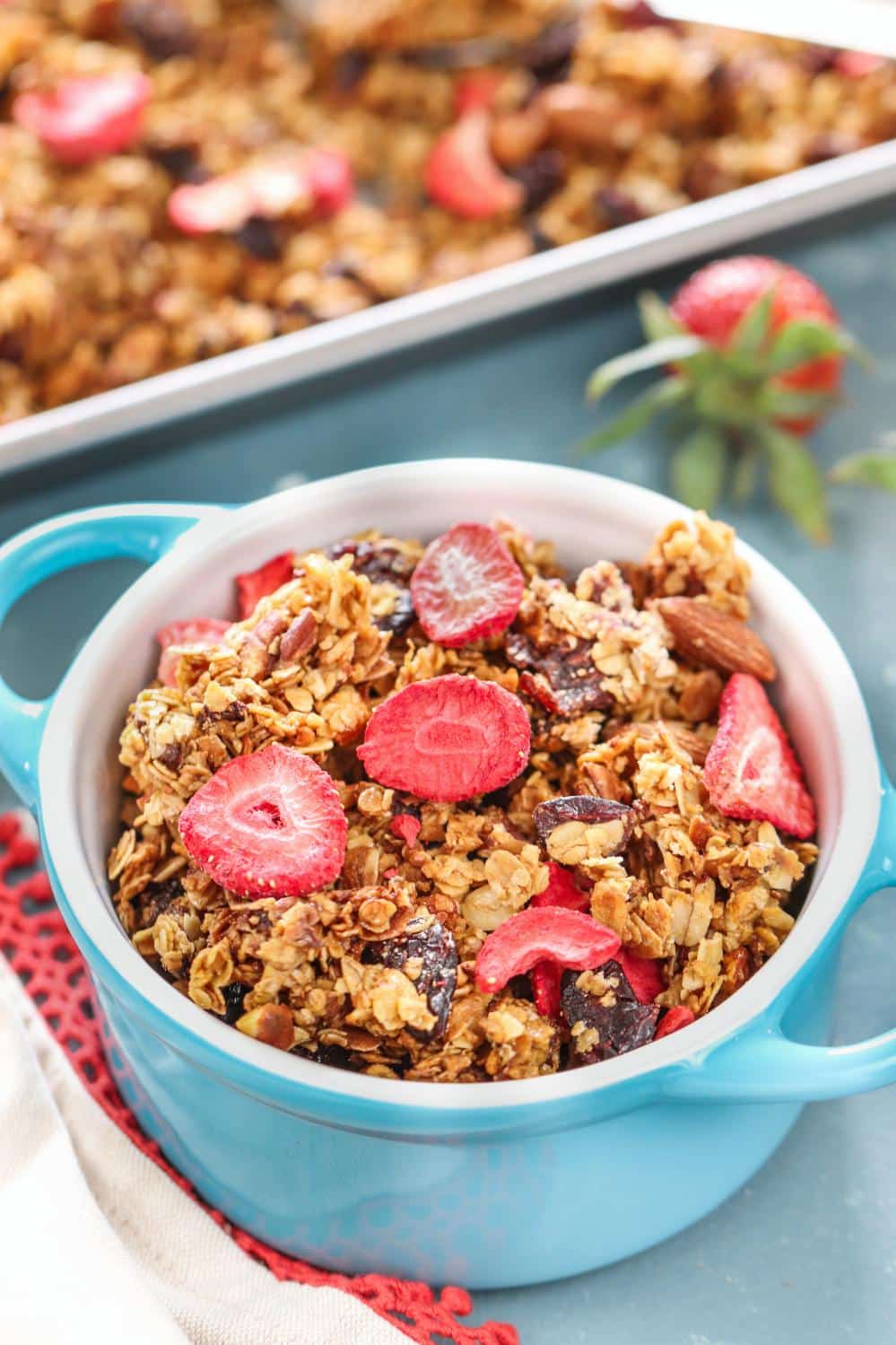 Top your morning breakfast bowl with this freshly baked, nutrient-dense, delicious Gluten Free Strawberry Almond Granola. A hearty breakfast that delivers a burst of flavor in every bite!