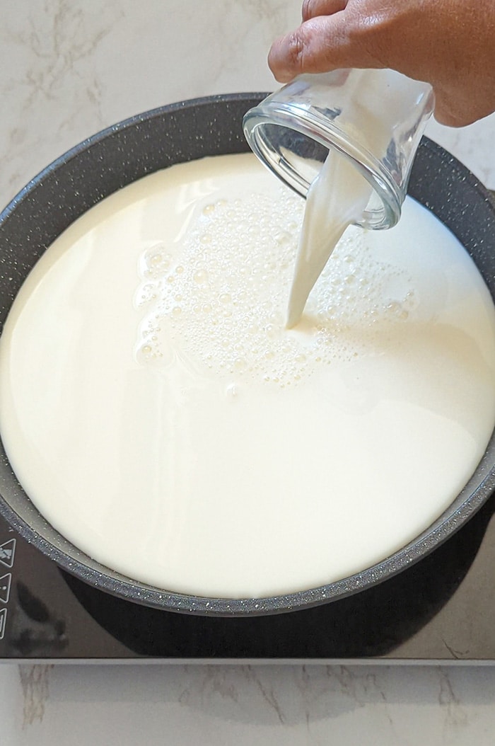- Add whole milk to a heavy-bottomed pan and bring it to a boil over medium heat. Keep stirring the milk at regular intervals.Tip — Full-fat milk produces the best chenna (paneer) that makes the creamiest and richest Kalakand; therefore, I highly recommend using whole-fat dairy. Low-fat milk can be used, but you must compromise with the result.