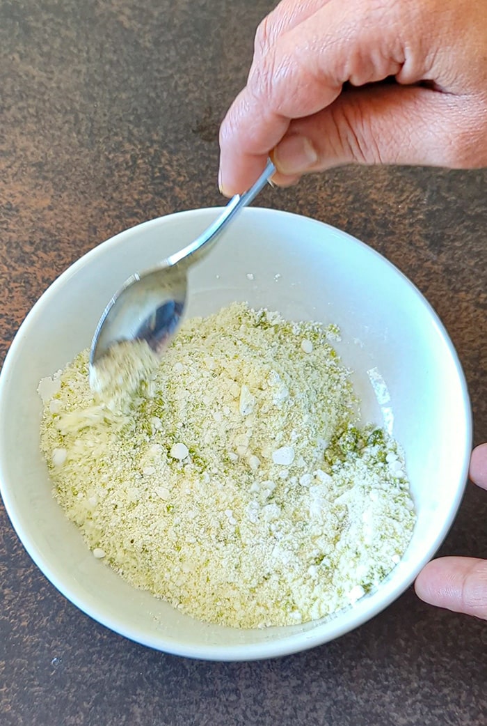 - Combine milk powder, powdered sugar, cardamom powder, and crushed pistachios in a bowl.