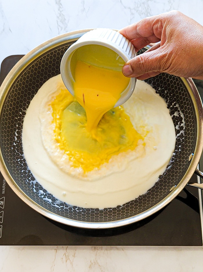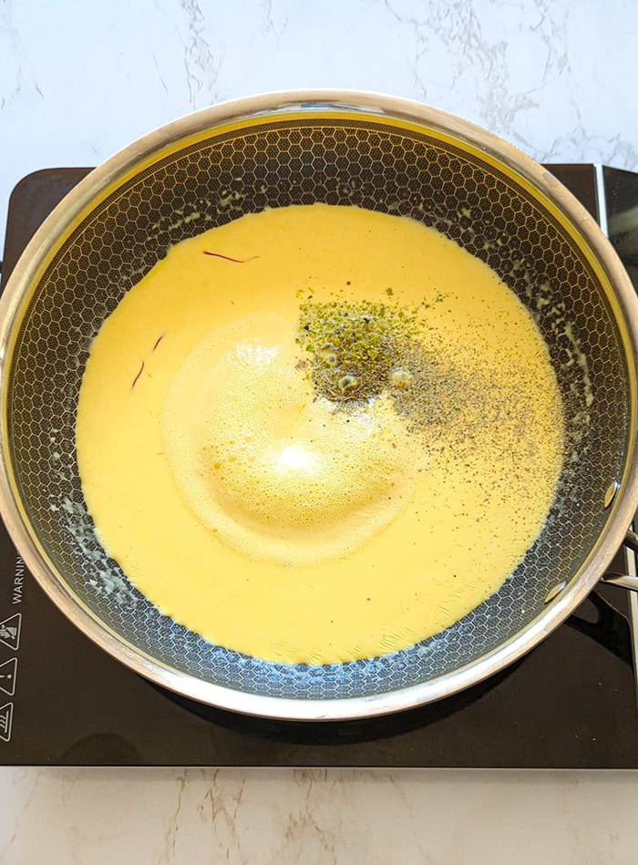 - Combine cream and saffron milk in a heavy-bottomed pan.