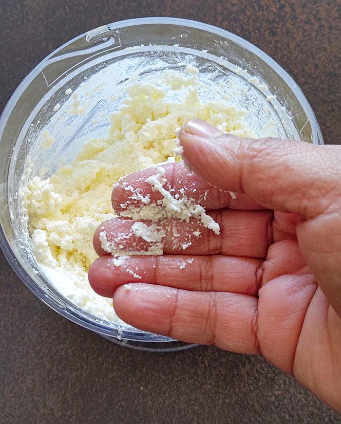 - Transfer the chenna to the food processor and pulse until it forms a smooth textured mix. Set it aside.