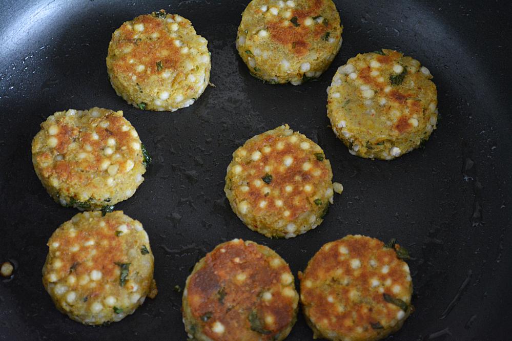 Fry in batches — Do not overcrowd the pan while frying the sabudana cutlets, as flipping will become difficult, and they may break in the process. They will also not get enough space to fry properly. Therefore, it is best to fry them in batches to give them room to get flipped easily and fry evenly.