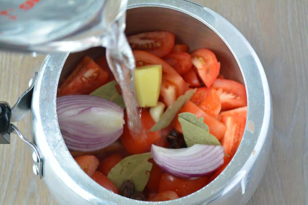 - Add water to the pressure cooker. Mix to combine. Close the lid and pressure cook the shorba for 4-5 whistles (20-25 minutes in a pressure cooker without whistle).