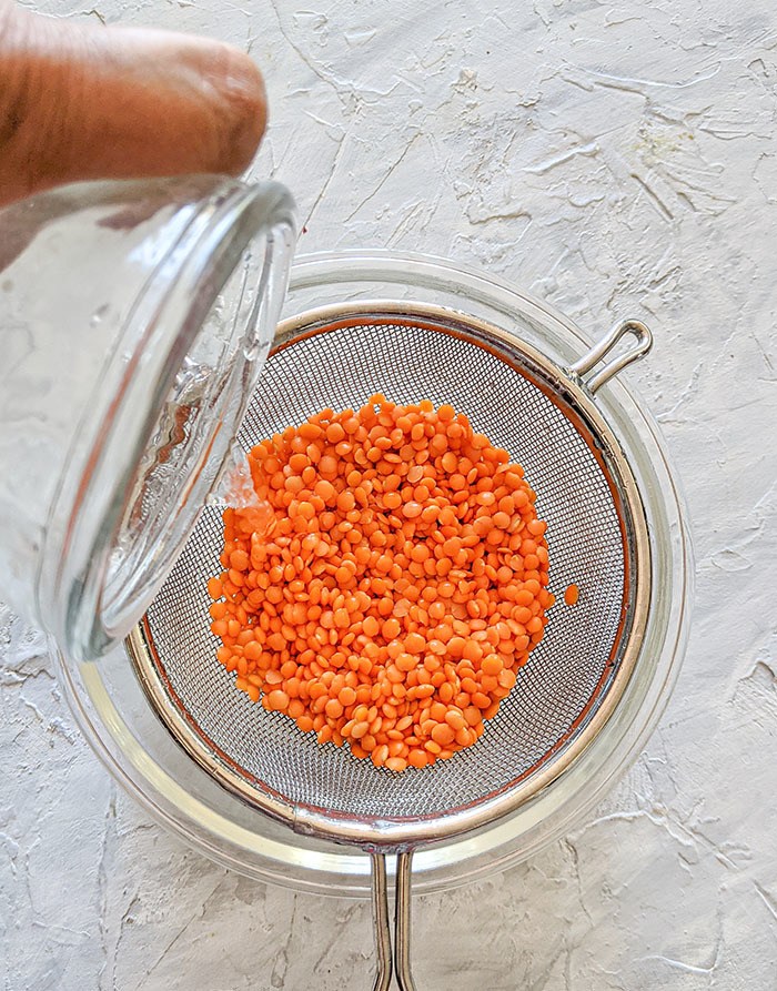 - Before you begin, check the lentils for small stones. Take a fine-meshed sieve and rinse the lentils under cold running water to clean any dirt or dust. Set it aside to drain.