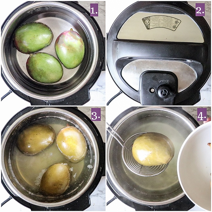 - Rinse the mangos under tap water. Gently rub them with your hands to remove any debris or deposits. Set aside. Add 1.5 cups of water to the Instant Pot insert. Add the rinsed mangoes to the insert. Place the lid on the Instant Pot. Seal and secure. Press the ‘Pressure cook button’ and cook on high pressure for 10 minutes. Make sure the venting knob is in the sealing position.Allow the pressure to release naturally. Once the pin drops, carefully open the Instant Pot. After the mangoes are boiled, they will lose their vibrant, rich green color and become soft and pulpy.