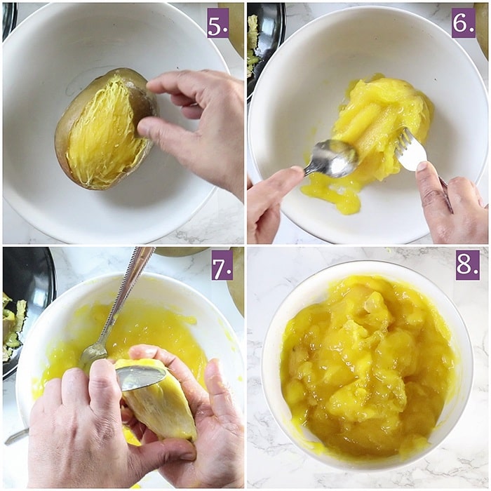 - Remove the mangoes from the boiled water and immerse them in ice-cold water to stop the cooking process altogether.Once the mangoes are comfortable to touch, peel the outer skin of the mangoes.Use a spoon to scoop out the pulp from the boiled mangoes. Scrape off the seed and extract all the pulp.