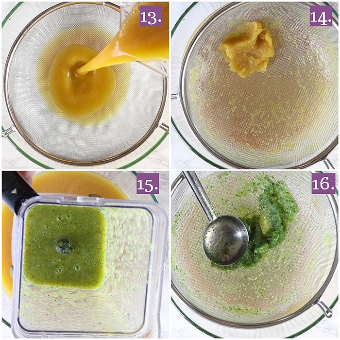 - Pass the pureed aam ka Panna through a fine-mesh strainer. Strain through the strainer, pressing to extract all the mango liquid into the bowl. Discard the mango fibers. Add fresh mint leaves to a blender. Pour in 1/2 cup of water and blend until smooth. Pass the mint puree through a fine-mesh strainer into the previously strained aam ka Panna. Discard the leftovers.