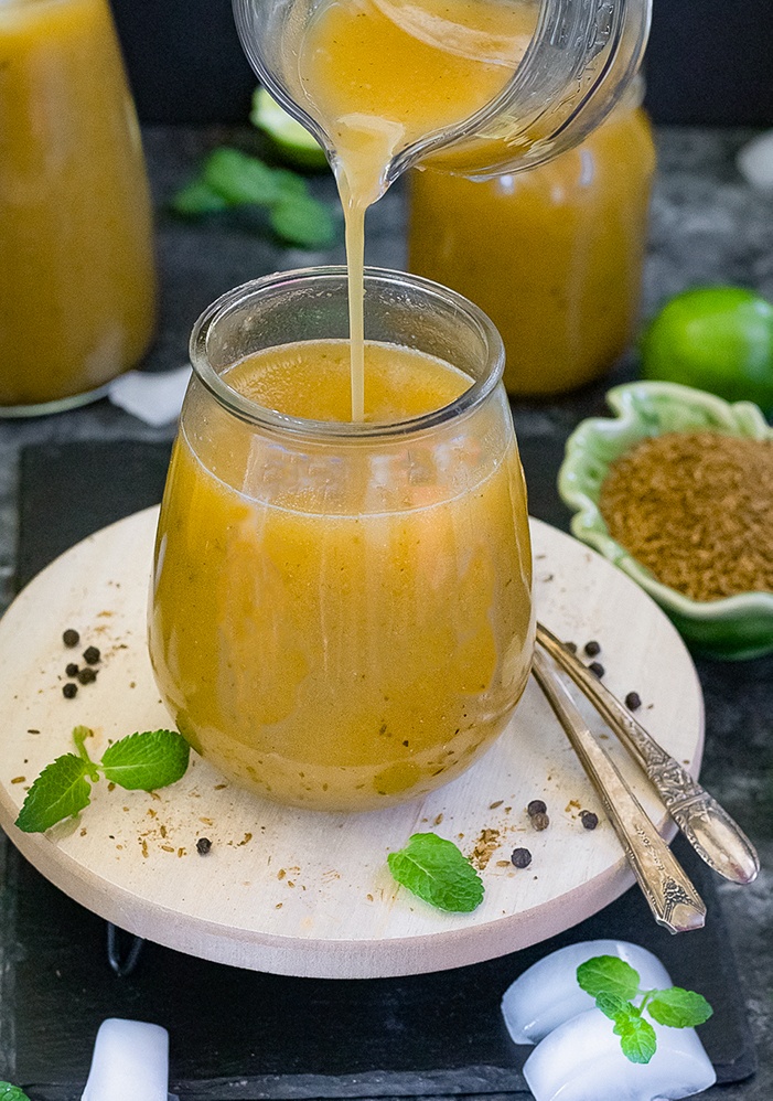 Jaggery — The sweet taste of jaggery will help lighten the bitter taste of the raw mangoes. It is used as a healthy alternative to sugar. Besides that, jaggery lends a beautiful caramel-golden shade to this drink.