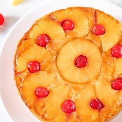 When baked and out of the oven, it is flipped upside down to reveal a wonderfully caramelized pineapple layer studded with cherries that beautify the freshly baked cake!
