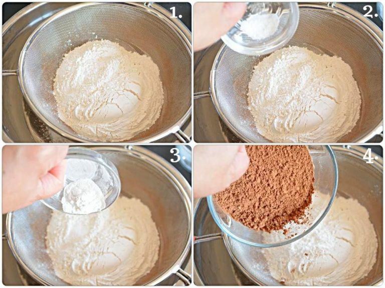 - Whisk together all-purpose flour, cornstarch, cocoa powder, baking soda, baking powder, and salt in a large mixing bowl. Sift them to remove lumps of flour and cocoa powder.