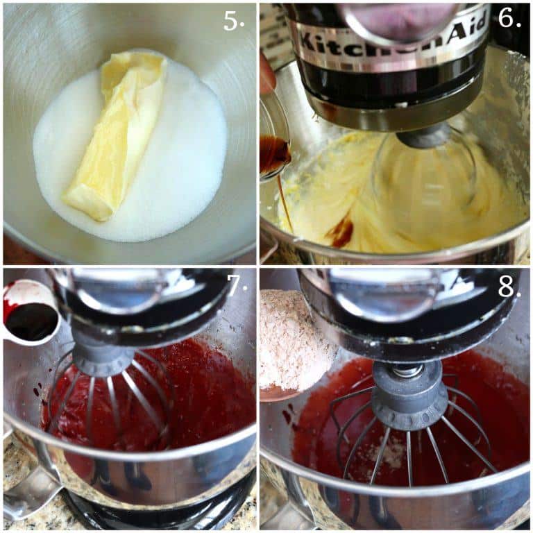 - Using a whisk or balloon attachment, cream butter and sugar together on medium speed for 4-5 minutes. Add vanilla essence to this mix.Add the red food coloring and milk + vinegar combo (buttermilk) to the mixing bowl.Mix in the dry ingredients.