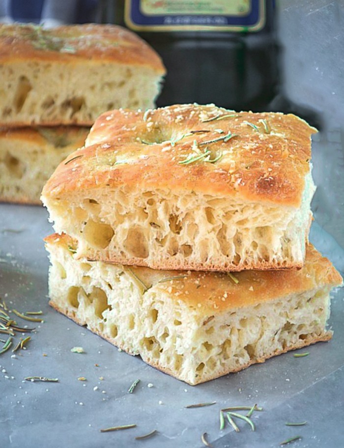 Focaccia has a delightful crisp outside with a soft and chewy inside.