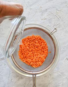 Before you begin, check the lentils for small stones. Take a fine-meshed sieve and rinse the lentils under cold running water to clean any dirt or dust. Set it aside to drain.